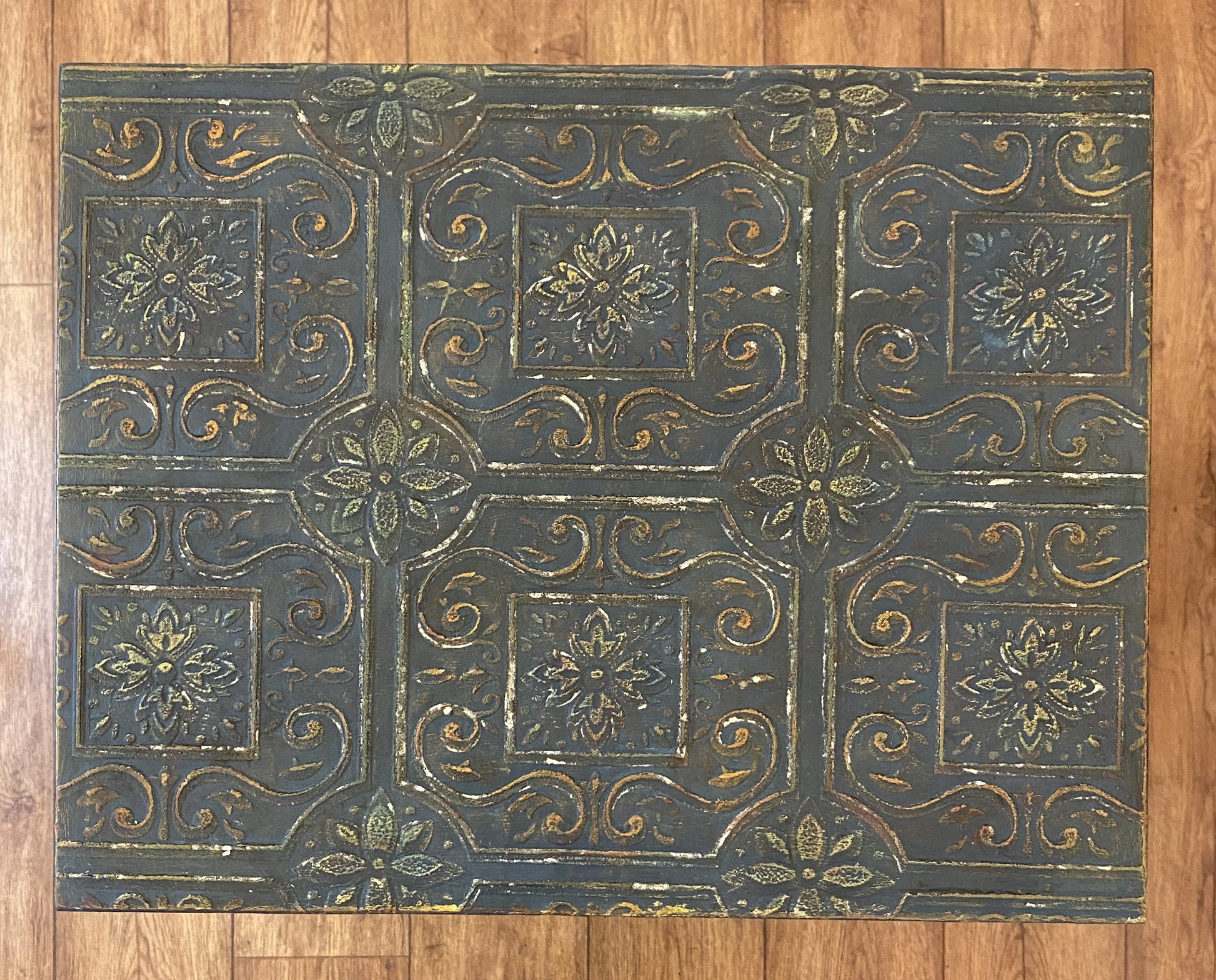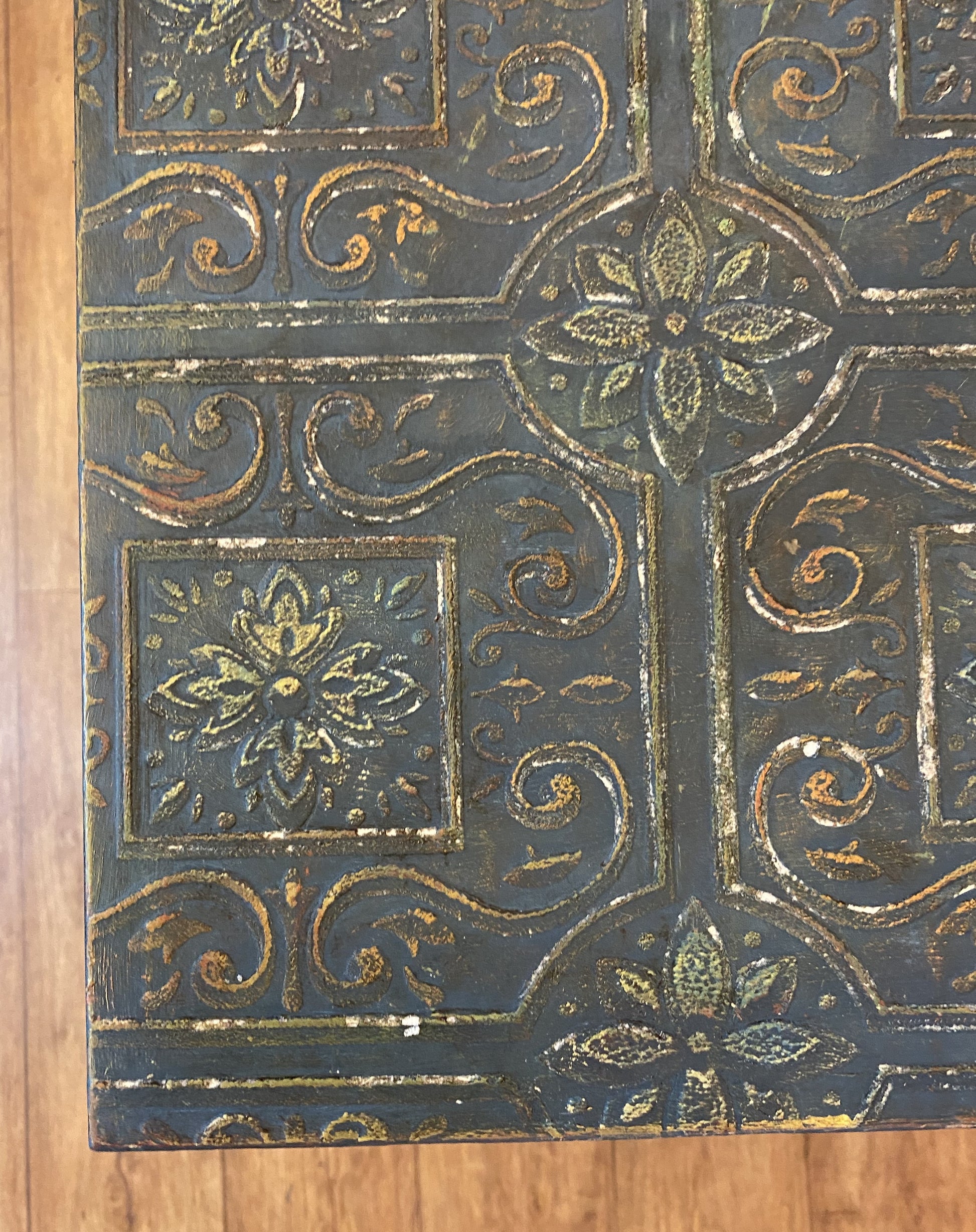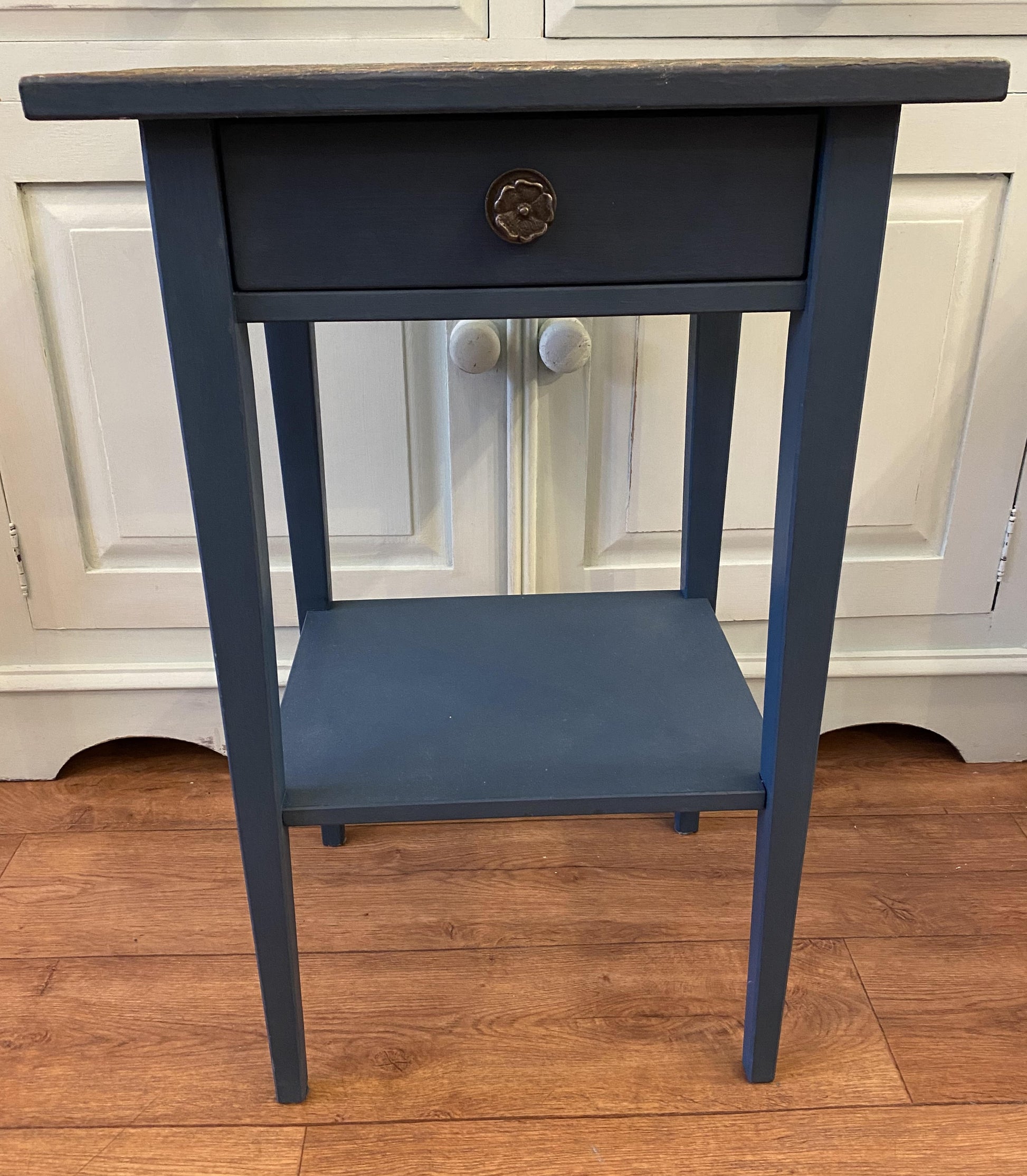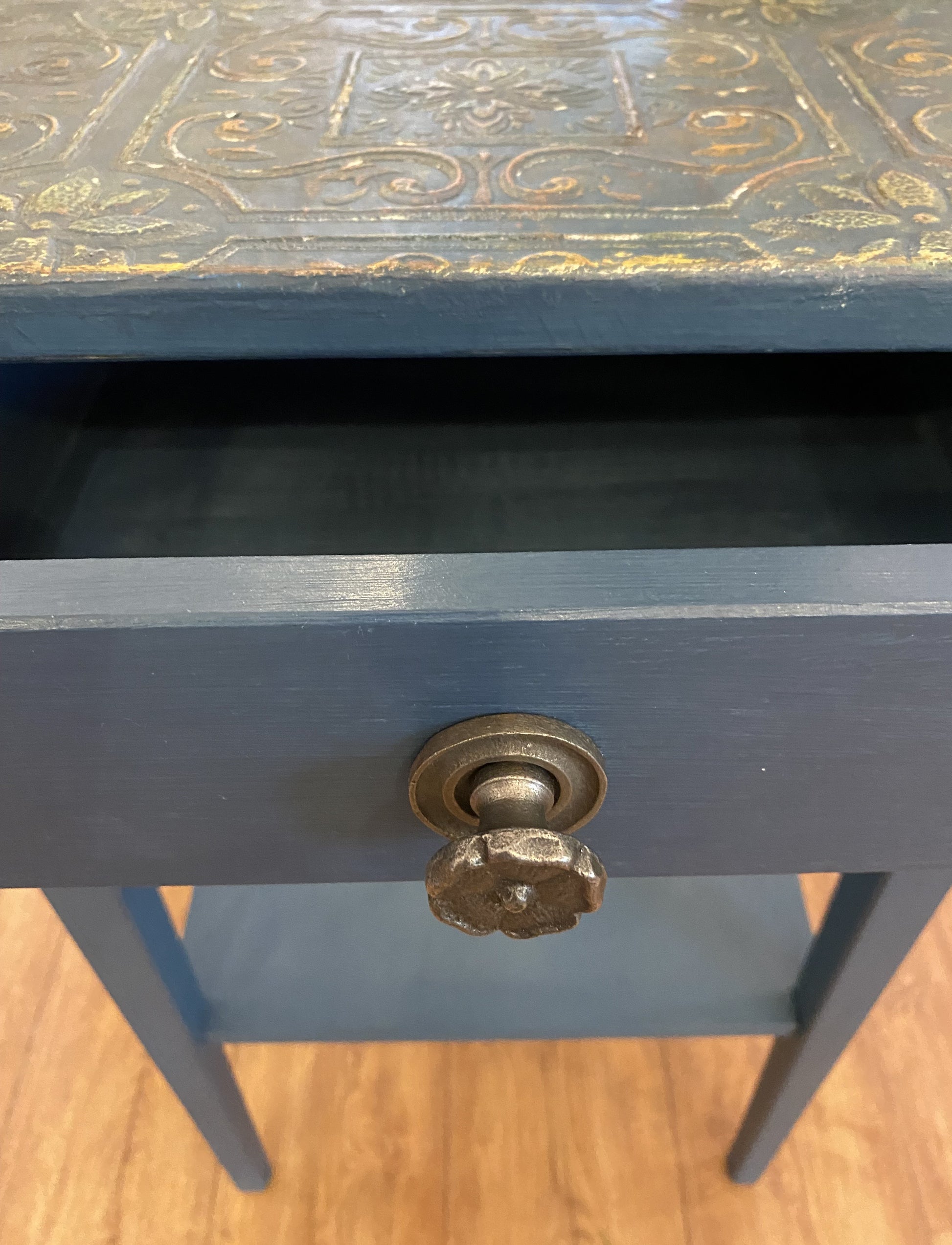 This elegant side table is painted with Aubusson Blue Chalk Paint. The tile effect top showcases a lovely combination of blues and a touch of gold which accentuates the raised surface design. A handy drawer is opened with an antique iron rose handle.